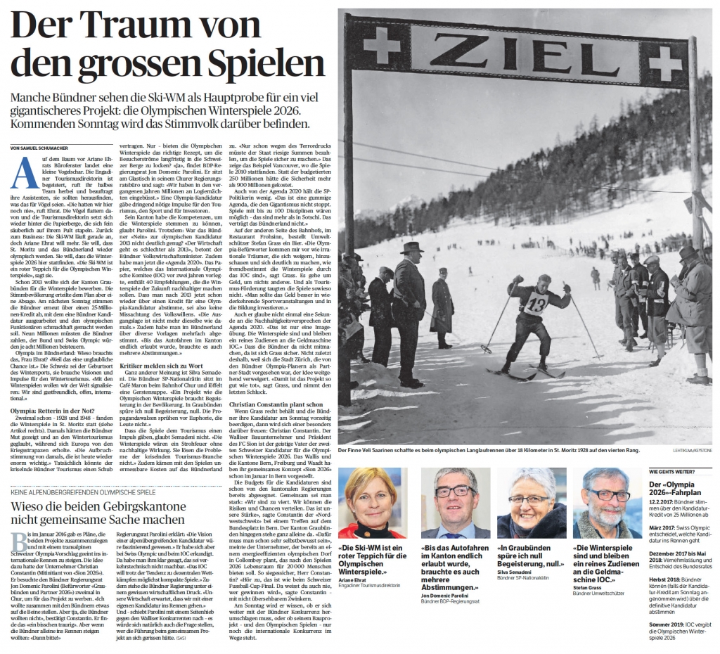 Manche Bündner sehen die Ski-WM als Hauptprobe für ein viel gigantischeres Projekt: die Olympischen Winterspiele 2026. Kommenden Sonntag wird das Stimmvolk darüber befinden. (Aargauer Zeitung)