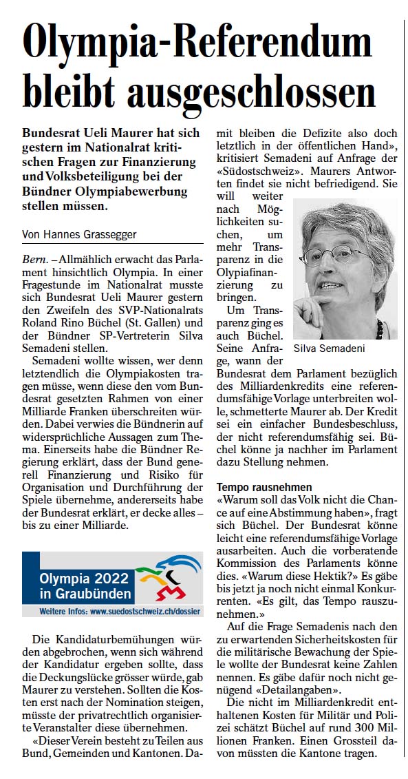 Allmählich erwacht das Parlament hinsichtlich Olympia. In einer Fragestunde im Nationalrat musste sich Bundesrat Ueli Maurer gestern den Zweifeln des SVP-Nationalrates Roland Rino Büchel (St. Gallen) und der Bündner SP-Vertreterin Silva Semadeni stellen. Semadeni wollte wissen, wer denn letztendlich die Olympiakosten tragen müsse, wenn diese den vom Bundesrat gesetzten Rahmen von einer Milliarde Franken überschreiten würden. Dabei verwies die Bündnerin auf widersprüchliche Aussagen zum Thema. Einerseits habe die Bündner Regierung erklärt, dass der Bund generell Finanzierung und Risiko für Organisation und Durchführung der Spiele übernehme, andererseits habe der Bundesrat erklärt, er decke alles – bis zu einer Milliarde. Die Kandidaturbemühungen würden abgebrochen, wenn sich während der Kandidatur ergeben sollte, dass die Deckungslücke grösser würde, gab Maurer zu verstehen. Sollten die Kosten erst nach der Nomination steigen, müsste der privatrechtlich organisierte Veranstalter diese übernehmen. «Dieser Verein besteht zu Teilen aus Bund, Gemeinden und Kantonen. Damit bleiben die Defizite also doch letztlich in der öffentlichen Hand», kritisiert Semadeni auf Anfrage der «Südostschweiz». Maurers Antworten findet sie nicht befriedigend. Sie will weiter nach Möglichkeiten suchen, um mehr Transparenz in die Olympiafinanzierung zu bringen.