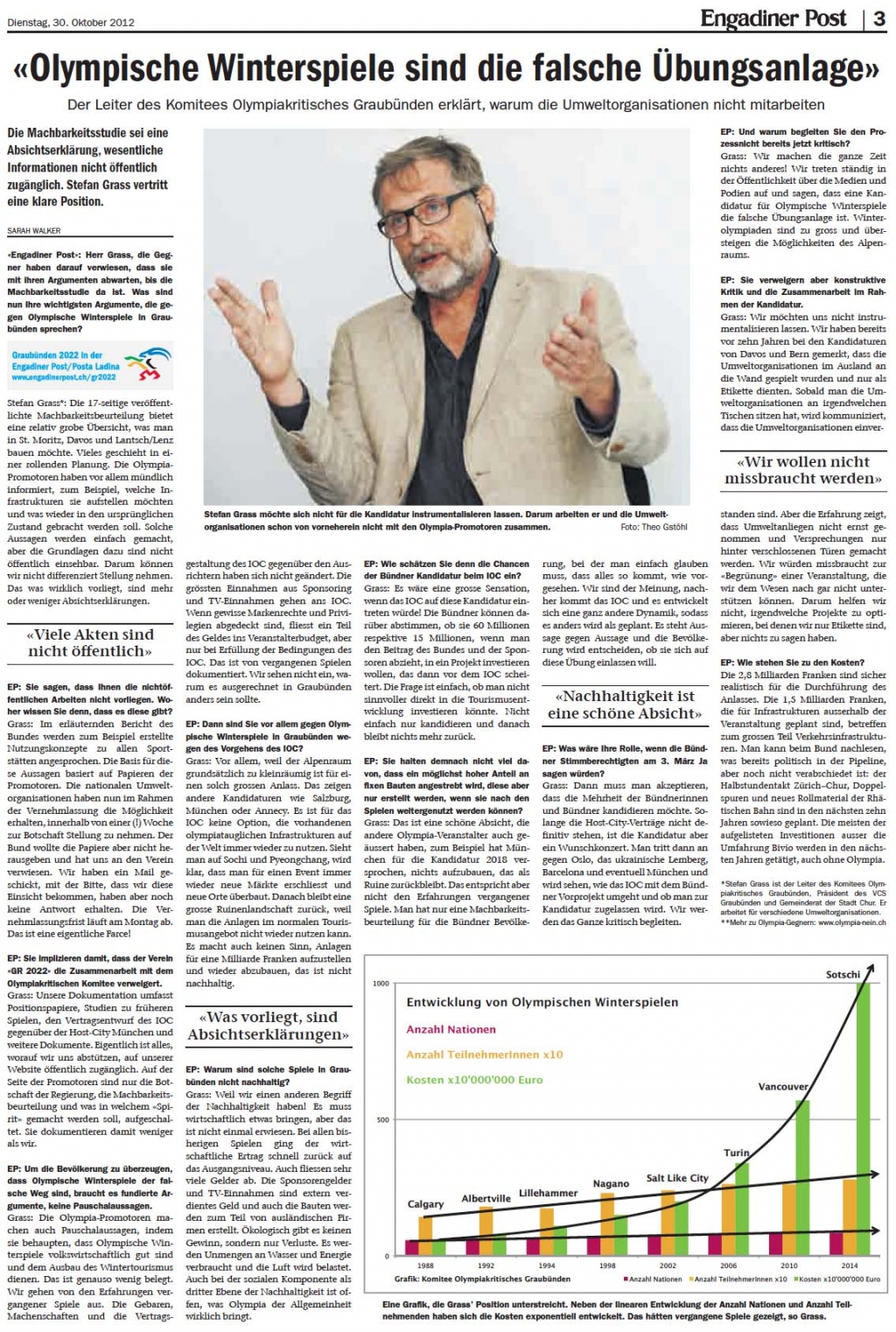 Der Leiter des Komitees Olympiakritisches Graubünden erklärt, warum die Umweltorganisationen nicht mitarbeiten Die Machbarkeitsstudie sei eine Absichtserklärung, wesentliche Informationen nicht öffentlich zugänglich. Stefan Grass vertritt eine klare Position (Engadiner Post).