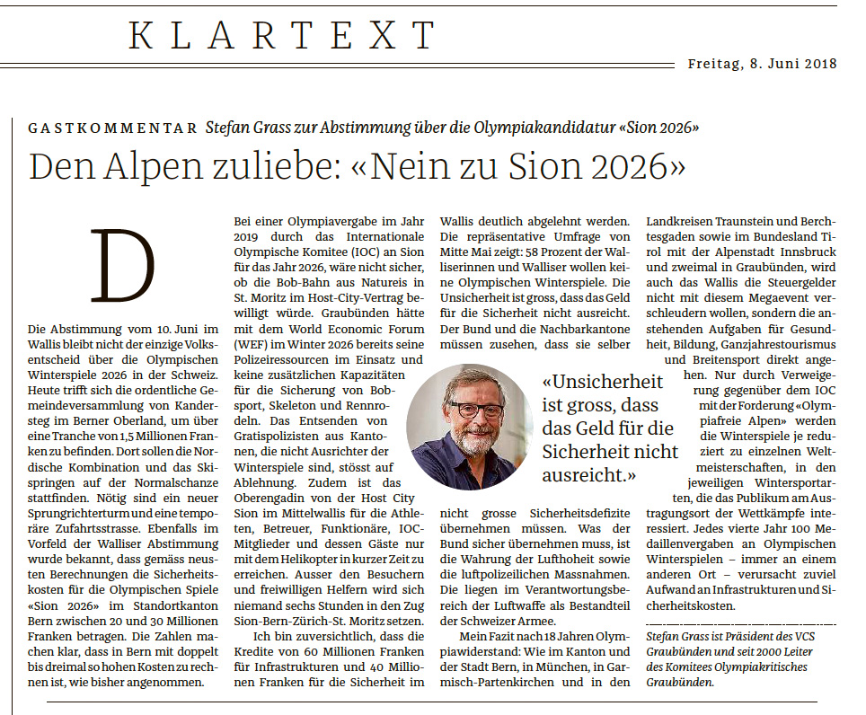 2018: Seit den Olympischen Winterspielen in Turin 2006 zeigt sich die fehlende Sinnhaftigkeit von solchen Sportgrossveranstaltungen im Alpenraum. Stefan Grass, Leiter des Komitees Olympiakritisches Graubünden, der seit 18 Jahren die Kandidaturen für Olympische Winterspiele in Graubünden für 2010, 2014, 2022 und 2026 erfolgreich bekämpfte, zieht Bilanz.