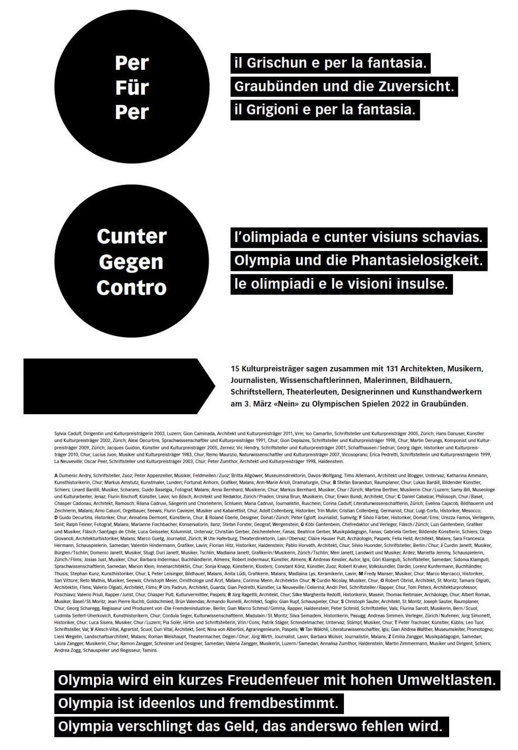 Das Manifest, angestiftet von Köbi Gantenbein, Chefredaktor von Hochparterre, und Chasper Pult, Kulturvermittler, lobt die Ideen, die Vielfalt und die Phantasie in Graubünden und sieht in Olympia ein «kurzes Freudenfeuer mit hohen Umweltlasten, das Geld verschlingt, das anderswo fehlen wird. Es wird die Vielfalt verbrennen und die Zuversicht verdampfen.» Die Architekten, Theaterleute, und Autoren wissen, dass in Graubünden viel Zuversicht, Phantasie, Wissen und Können blühen, die den Menschen, ihrer Kultur und Wirtschaft mehr nützen als blauäugige, überdrehte und fremdbestimmte Anlässe wie die Olympischen Spiele 2022. Das Manifest und die Liste der Unterzeichnerinnen und Unterzeichner wird als Inserat in den grossen Zeitungen Graubündens erscheinen, als Flugblatt verteilt und kann auf www.olympia-nein.ch. studiert werden.