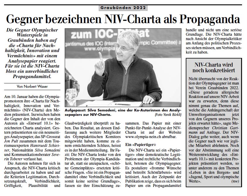 Am 10. Januar haben die Olympia-Promotoren die Charta für Nachhaltigkeit, Innovation und Vermächtnis (NIV-Charta) öffentlich gemacht. Das Komitee Olympiakritisches Graubünden hat diese Charta unter die Lupe genommen und kommt in einem Analysepapier zu einem vernichtenden Ergebnis. Die NIV-Charta sei ein Papiertiger ohne demokratische Legitimation und rechtliche Verbindlichkeit. Postuliert würden fromme Wünsche, anstatt kritische Fragen zu stellen. Zudem hätte die Charta am Anfang des Prozesses stehen müssen, um Verbindlichkeiten zu haben. Die Verfasser des Analysepapiers, Grossrat Jon Pult (SP), Nationalrätin Silva Semadeni (SP), Tourismusexperte Hansruedi Schiesser und Kommunikationsberater Severin Toberer kommen deshalb zum Schluss, dass es sich beim Papier um ein Propagandamittel handelt und nicht um eine seriöse Grundlage.