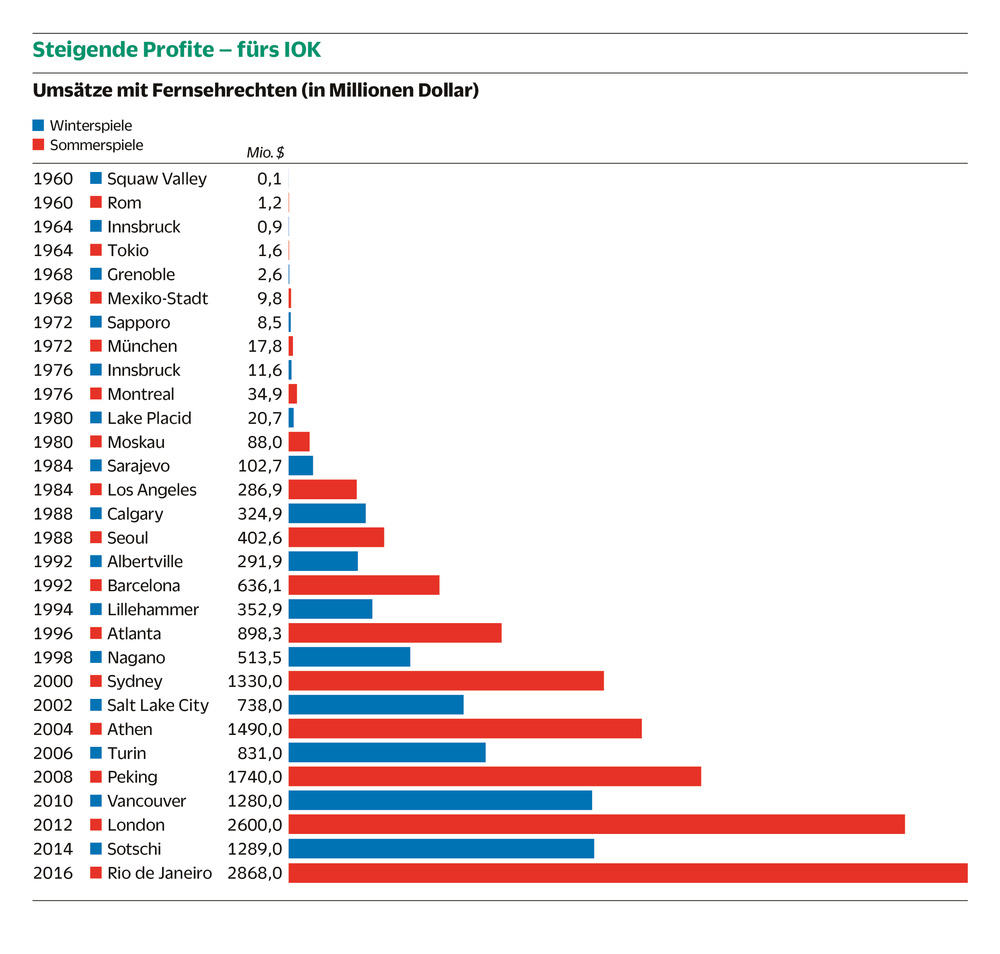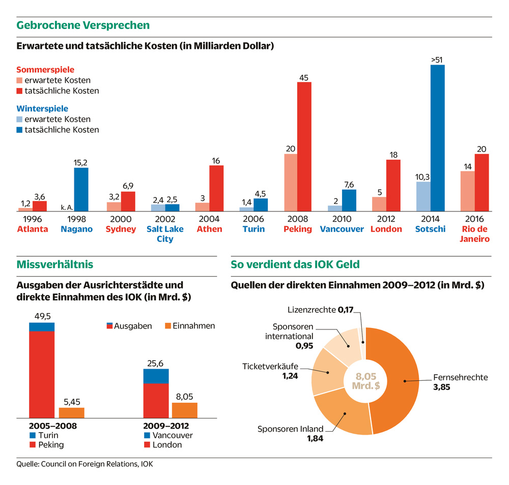 Das IOK gibt zwar den grössten Teil seiner immer noch zunehmenden Einnahmen weiter, die dank der Vergabe von Fernseh- und Lizenzrechten, Sponsoren sowie dem Verkauf von Tickets und Lizenzrechten entstehen. Aber die Kosten, die an den Ausrichtern hängenbleiben, steigen noch schneller, weil die Zahl der Wettbewerbe zunimmt, weil die Anforderungen an die Sportstätten steigen und weil es immer schwerer wird, Sportler und Fans vor Anschlägen zu schützen.