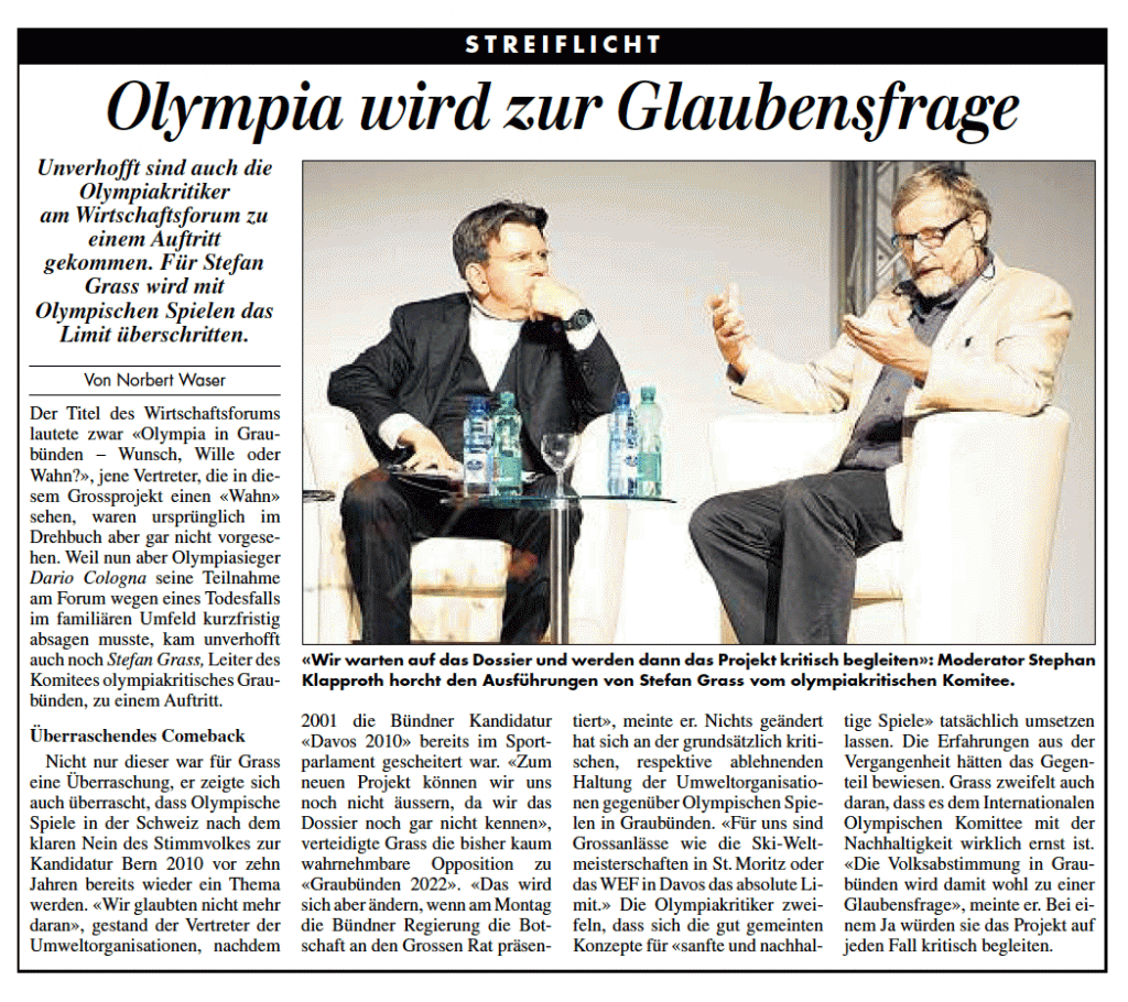 Unverhofft sind auch die Olympiakritiker am Wirtschaftsforum zu einem Auftritt gekommen. Für Stefan Grass wird mit Olympischen Spielen das Limit überschritten (Bündner Tagblatt).