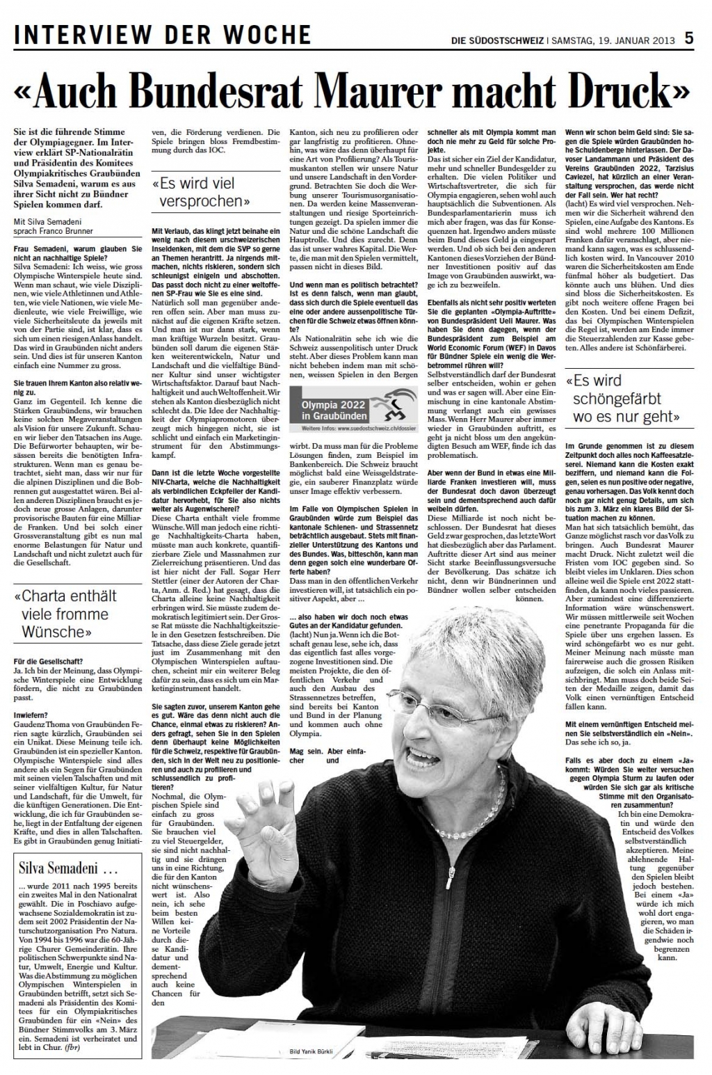 Sie ist die führende Stimme der Olympiagegner. Im Interview erklärt SP-Nationalrätin und Präsidentin des Komitees Olympiakritisches Graubünden Silva Semadeni, warum es aus ihrer Sicht nicht zu Bündner Spielen kommen darf (Die Südostschweiz).