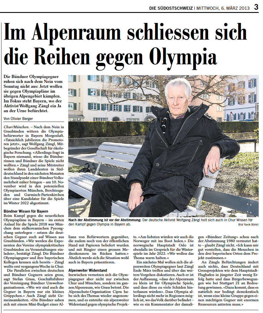 Die Bündner Olympiagegner ruhen sich nach dem Nein vom Sonntag nicht aus: Jetzt wollen sie gegen Olympiapläne im übrigen Alpengebiet kämpfen. Im Fokus steht Bayern, wo der Aktivist Wolfgang Zängl ein Ja an der Urne befürchtet (Die Südostschweiz).