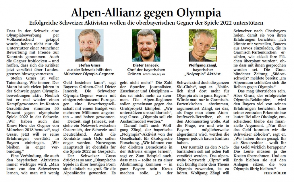 Chur/München. – Nach dem Nein in Graubünden wittern die Olympiabefürworter in Bayern Morgenluft. «Tatsächlich jubilieren die Promotoren jetzt», sagt Wolfgang Zängl, Mitbegründer der Gesellschaft für ökologische Forschung. «Allerdings fragt in Bayern niemand, wieso die Bündnerinnen und Bündner die Spiele nicht wollten.» Zängl und seine Mitstreiter wollen ihren Landsleuten in Süddeutschland in den nächsten Monaten den Standpunkt einer Bündner Volksmehrheit näher bringen – am 10. November wird in den potenziellen Olympiaorten München, Berchtesgaden und Garmisch-Partenkirchen über eine Kandidatur für die Spiele im Winter 2022 abgestimmt.