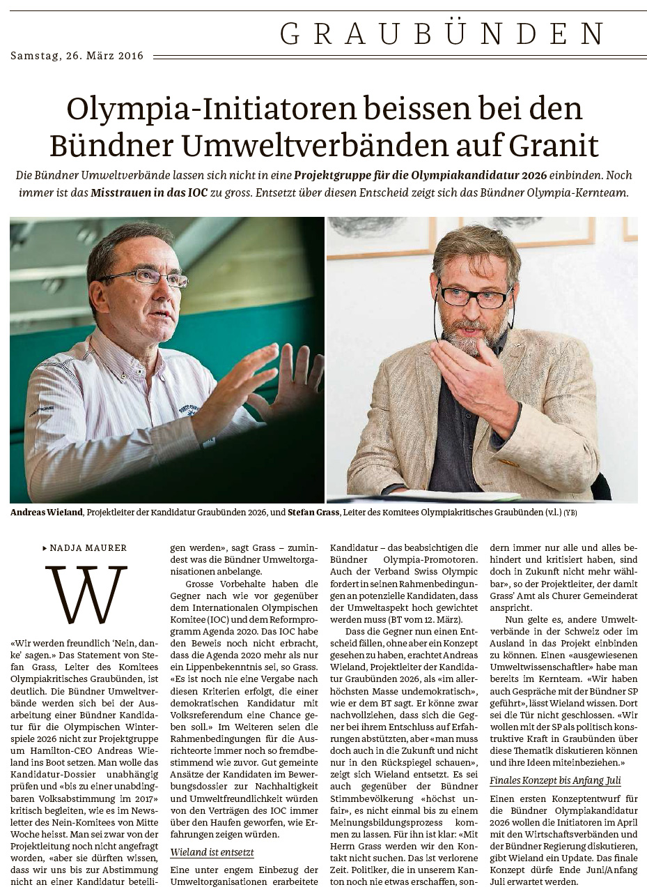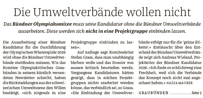 Das Bündner Olympiakomitee muss seine Kandidatur ohne die Bündner Umweltverbände ausarbeiten. Diese werden sich nicht in eine Projektgruppe einbinden lassen. Die Ausarbeitung einer Bündner Kandidatur für die Durchführung der Olympischen Winterspiele 2026 wird ohne die Bündner Umweltverbände stattfinden müssen. (BT)