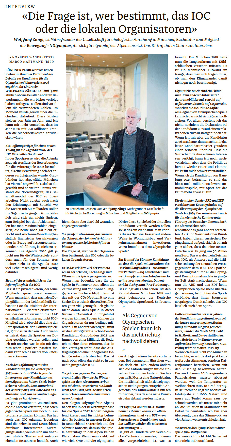 Wolfgang Zängl ist Mitbegründer der Gesellschaft für ökologische Forschung in München, Buchautor und Mitglied der Bewegung «NOlympia», die sich für olympiafreie Alpen einsetzt. Das BT traf ihn in Chur zum Interview.