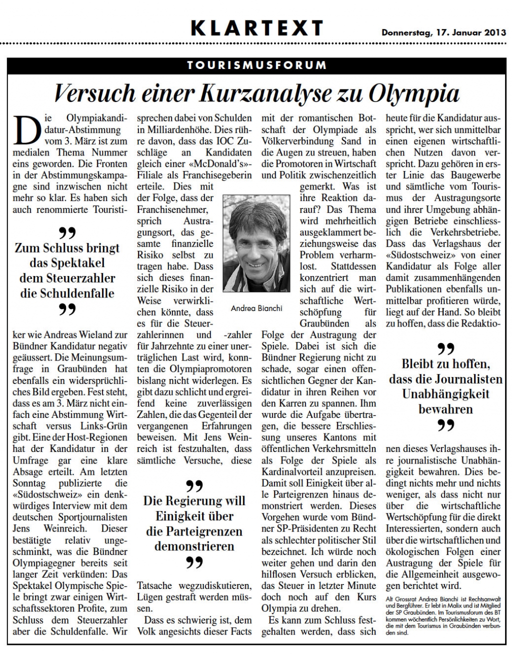 17.01.2013 Klartext von Andrea Bianchi im Bündner Tagblatt