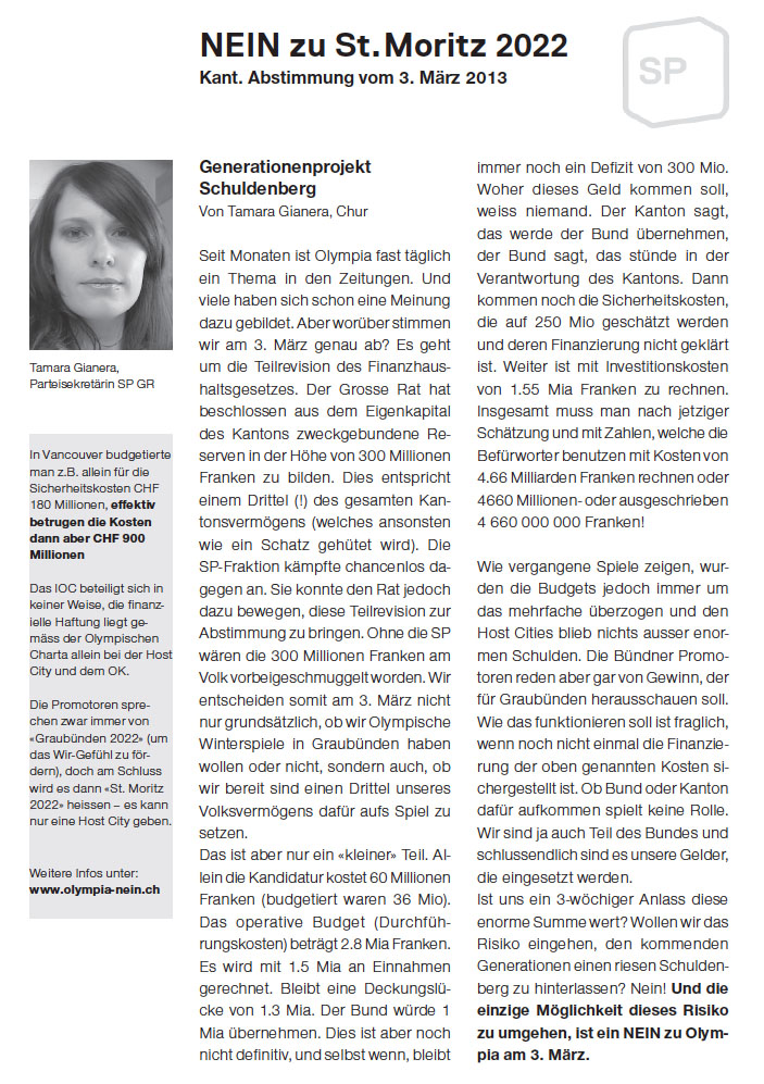 2018: Seit den Olympischen Winterspielen in Turin 2006 zeigt sich die fehlende Sinnhaftigkeit von solchen Sportgrossveranstaltungen im Alpenraum. Stefan Grass, Leiter des Komitees Olympiakritisches Graubünden, der seit 18 Jahren die Kandidaturen für Olympische Winterspiele in Graubünden für 2010, 2014, 2022 und 2026 erfolgreich bekämpfte, zieht Bilanz.