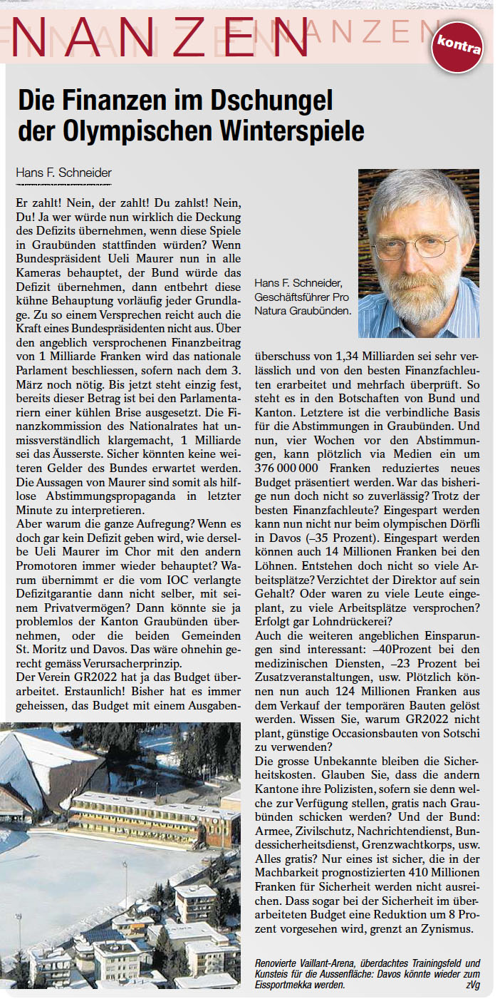 15.02.2013 Zu den Finanzen von Hans F. Schneider in der Davoser Zeitung